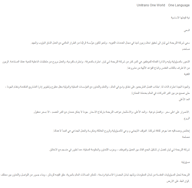 الشعور بالمسؤولية وليه والادارة الفعاله للموظفين هي اثمن كنز من شركة الترجمة شي ليان. احترام بالمعرفة ، واحترام بالفردية، والعمل بروح من متطلبات الداخلية لتنمية عملنا المستدامة. الزبون من الاعتراف بالكتاب المقدس واتباع القواعد الآلهة من مشروعنا.