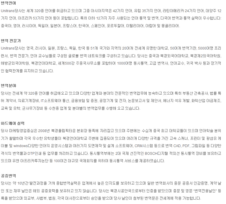 Unitrans당사는 영국, 러시아, 일본, 프랑스, 독일, 한국 등 51개 국가와 지역의 20여개 전세계 유명한 대학교, 50여개 번역기관, 5000여명 프리랜서, 번역 전문가, 언어 교수님들로 구성된 글로블 번역 네트워크를 구성하고 있습니다. 당사는 중국과 북경외국어대학교, 북경제2외국어학원, 해방군외국어학원, 북경언어대학교, 세계500강 주중국사무소를 포함하여 1000여명 동시통역, 고급 번역사, 언어교수, 귀국 박사 등과 장기적인 협력관계를 유지하고 있습니다.