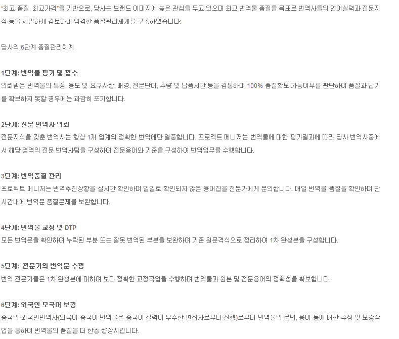 “최고 품질, 최고가격”을 기반으로, 당사는 브랜드 이미지에 높은 관심을 두고 있으며 최고 번역물 품질을 목표로 번역사들의 언어실력과 전문지식 등을 세밀하게 검토하며 엄격한 품질관리체계를 구축하였습니다: