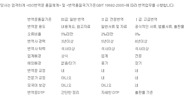 당사는 엄격하게 <ISO번역문 품질체계> 및 <번역품질국가기준GB/T 19682-2005>에 따라 번역업무를 수행합니다: