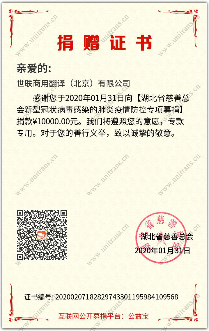 新型冠狀病毒肺炎疫情,牽動(dòng)著(zhù)全體世聯(lián)翻譯人的心。1月27日農歷大年初三,世聯(lián)商用翻譯(北京)有限公司向湖北省慈善總會(huì )首筆捐款人民幣10,000.00元,用于湖北省和武漢市防控抗擊新型肺炎疫情、采購一線(xiàn)醫療機構急需的醫療防護物資等。據了解,該筆捐款目前已經(jīng)匯入湖北省慈善總會(huì )賬戶(hù),湖北省慈善總會(huì )賬戶(hù)是湖北省新型冠狀病毒感染的肺炎防控指揮部接受捐贈的指定賬戶(hù)之一,捐贈款物除定向捐贈外,原則上由省指揮部統一調配使用。慈善機構將依法依規及時(shí)公布捐贈款物接收和使用情況,接受社會(huì )監督。世聯(lián)翻譯全體同事和譯員向奮戰在抗擊疫情一線(xiàn)的醫務(wù)工作者致敬,向每一位參與疫情防控的工作者和疫區的同胞們致敬!我們堅信一定能打贏(yíng)這場(chǎng)防疫之戰。疫情無(wú)情,人間有愛(ài)。世聯(lián)翻譯將持續關(guān)注疫情進(jìn)展,積極響應上級關(guān)于疫情防控各項工作要求,保障員工安全,及時(shí)復工,發(fā)揮專(zhuān)業(yè)優(yōu)勢,做好疾控國際交流和藥械引進(jìn)等翻譯工作,以實(shí)際行動(dòng)為打贏(yíng)這場(chǎng)攻堅戰貢獻自身力量。世聯(lián)翻譯是專(zhuān)業(yè)的語(yǔ)言服務(wù)供應商,長(cháng)期為政務(wù)和國際組織、跨國公司和大中型企業(yè)、學(xué)術(shù)科研機構等B端用戶(hù)提供優(yōu)質(zhì)的的“文檔筆譯、同傳口譯、影音字幕、勞務(wù)派遣和行業(yè)級翻譯解決方案”。世聯(lián)生物醫療行業(yè)解決方案加速新藥全球上市,讓愛(ài)穿越時(shí)空。世聯(lián)工程能源核電裝備行業(yè)解決方案,助力中資企業(yè)快速進(jìn)軍國際市場(chǎng)。Unitrans世聯(lián)翻譯公司在您身邊,離您近的翻譯公司,心貼心的專(zhuān)業(yè)服務(wù),專(zhuān)業(yè)的全球語(yǔ)言翻譯與信息解決方案供應商,專(zhuān)業(yè)翻譯機構品牌。無(wú)論在本地,國內還是海外,我們的專(zhuān)業(yè)、星級體貼服務(wù),為您的事業(yè)加速!世聯(lián)翻譯公司在北京、上海、深圳等國際交往城市設有翻譯基地,業(yè)務(wù)覆蓋全國城市。每天有近百萬(wàn)字節的信息和貿易通過(guò)世聯(lián)走向全球!積累了大量政商用戶(hù)數據,翻譯人才庫數據,多語(yǔ)種語(yǔ)料庫大數據。世聯(lián)品牌和服務(wù)品質(zhì)已得到政務(wù)防務(wù)和國際組織、跨國公司和大中型企業(yè)等近萬(wàn)用戶(hù)的認可。 專(zhuān)業(yè)翻譯公司,北京翻譯公司,上海翻譯公司,英文翻譯,日文翻譯,韓語(yǔ)翻譯,翻譯公司排行榜,翻譯公司收費價(jià)格表,翻譯公司收費標準,翻譯公司北京,翻譯公司上海。