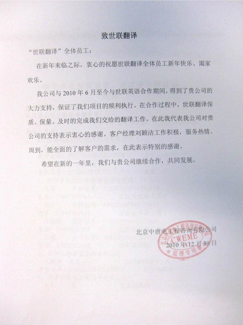 北京中唐電工程咨詢(xún)有限公司反饋--世聯(lián)博眾翻譯北京公司好不好?