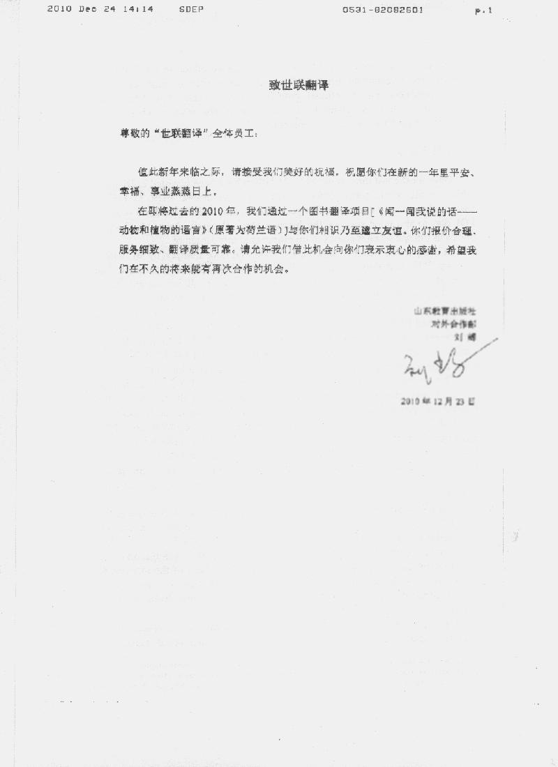 在即將過(guò)去的2010年,我們通過(guò)一個(gè)圖書(shū)翻譯項目【《聞一聞我說(shuō)的話(huà)------動(dòng)物和植物的語(yǔ)言》(原著(zhù)為荷蘭語(yǔ))】與你們相識乃至建立友誼,你們報價(jià)合理、服務(wù)細致、翻譯質(zhì)量可靠。請允許我們借此機會(huì )向你們表示衷心的感謝,希望我們在不久的將來(lái)能有再次合作的機會(huì )。