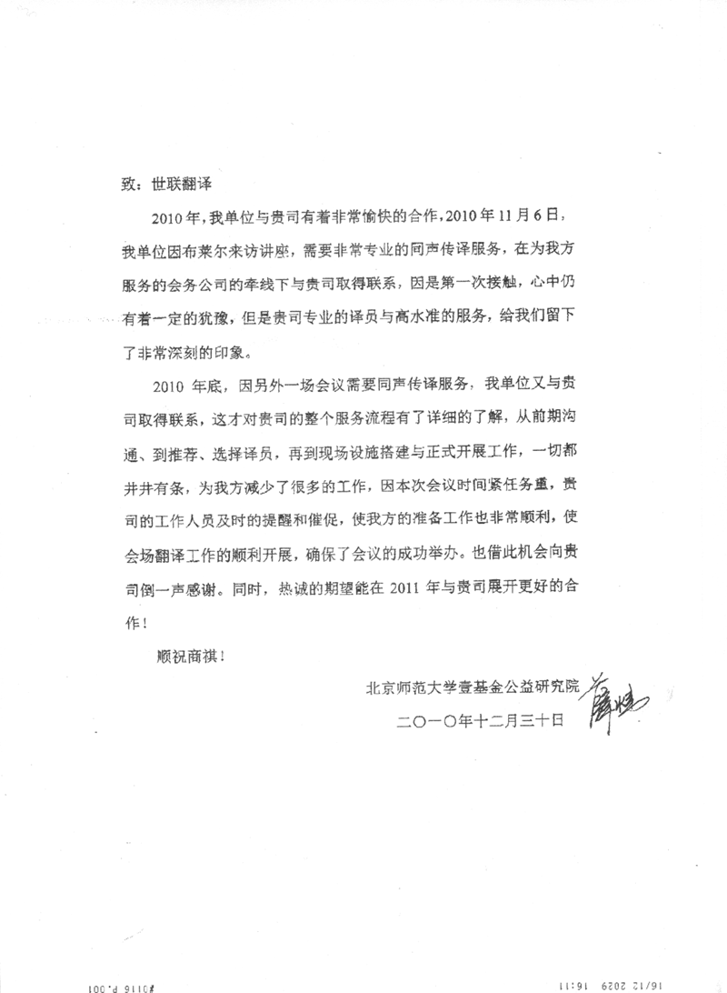 北京師范大學(xué)壹基金公益研究院反饋--世聯(lián)博眾翻譯(北京)有限公司