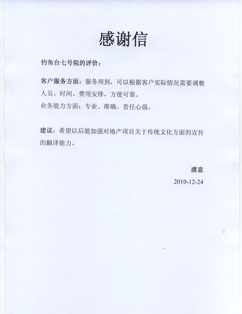 建議:希望以后能加強對地產(chǎn)項目關(guān)于傳統文化方面的宣傳的翻譯能力。 虞意 2010-12-24