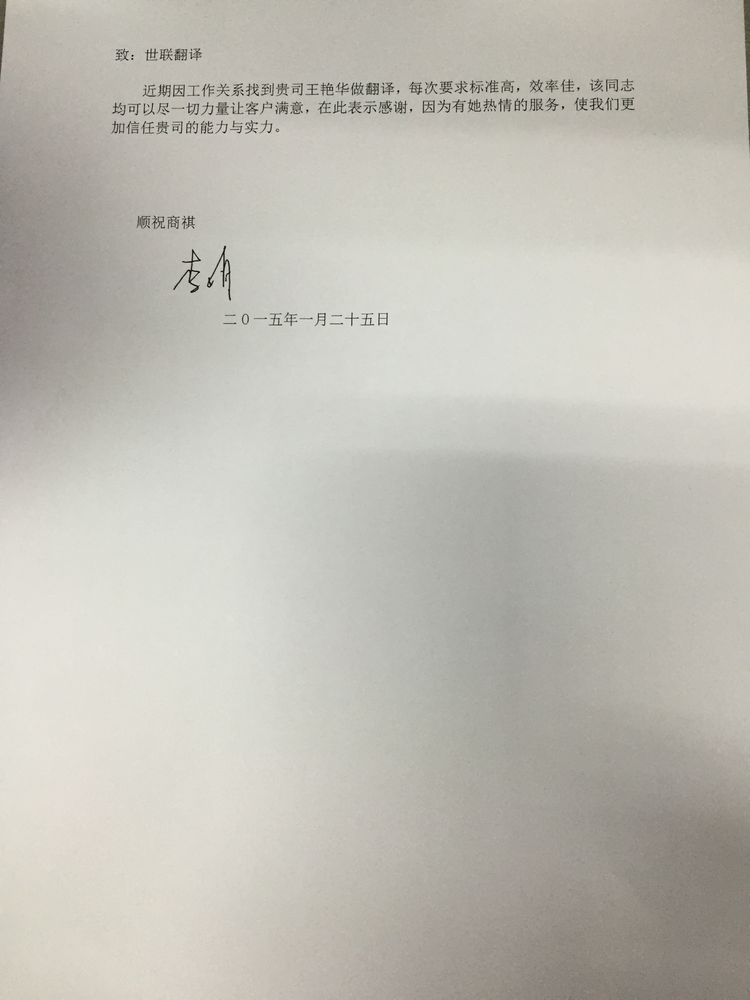 • “我司在2014年與貴公司建立合作關(guān)系,貴公司的翻譯服務(wù)質(zhì)量高、速度快、態(tài)度好,贏(yíng)得了我司各部門(mén)的一致好評。貴司經(jīng)理工作認真踏實(shí),特此致以誠摯的感謝!”