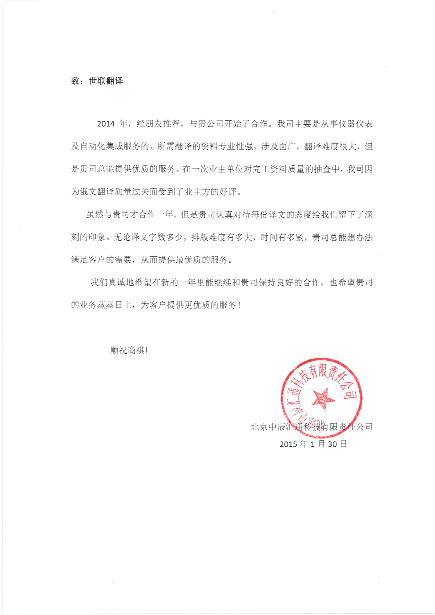 • “我司在2014年與貴公司建立合作關(guān)系,貴公司的翻譯服務(wù)質(zhì)量高、速度快、態(tài)度好,贏(yíng)得了我司各部門(mén)的一致好評。貴司經(jīng)理工作認真踏實(shí),特此致以誠摯的感謝!”