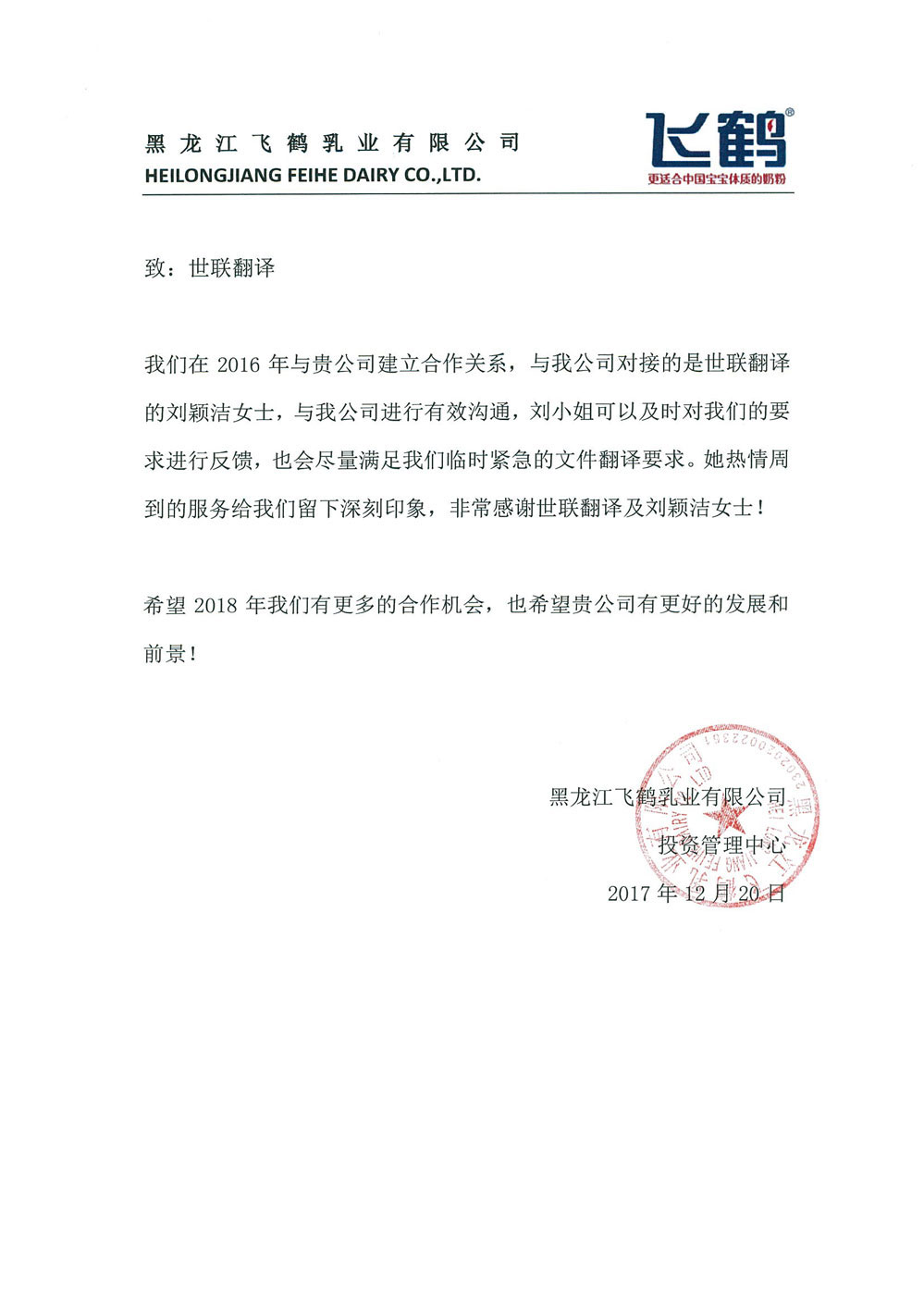 黑龍江飛鶴乳業(yè)有限公司致世聯(lián)翻譯的一封信