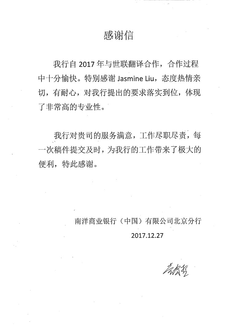 南洋商業(yè)銀行(中國)有限公司北京分行致世聯(lián)翻譯公司一封信