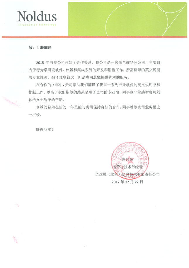 諾達思(北京)信息技術(shù)有限責任公司致世聯(lián)翻譯一封信