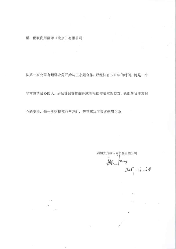 淄博安茂福國際貿易有限公司對世聯(lián)翻譯公司的評價(jià)